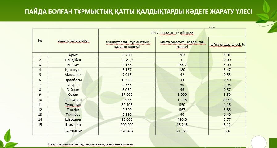 Айта кетерлігі, полигон жанынан жылдық қуаттылығы 200 мың тоннаны құрайтын қоқыс сұрыптау зауытын «Цеснабанк» пен «Технология-21» инвесторлары 2017 жылдың күзінде іске қосып, жұмыстарын бастаған болатын. Өткен жылы сұрыпталып кәдеге жаратуға бағытталған қалдықтардың көлемі Шымкент қаласы бойынша 9 пайызды құраған.
