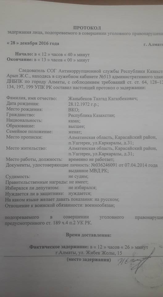 Тергеу дерегі бойынша, Талғат Жәнібековты 28 желтоқсан күні жемқорлыққа қарсы күрес Ұлттық бюросы Алматы департаментінің қызметкерлері ұстаған.