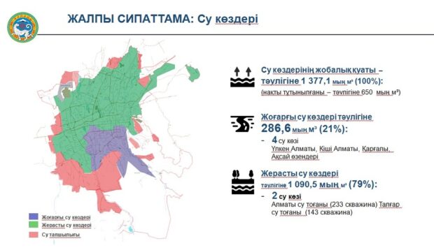 Бүгінде Алматы сумен жобалық қуаты тәулігіне 1 миллион 377 мың текше метрді құрайтын 6 негізгі су көздерімен қамтамасыз етілуде. Бұлар – Үлкен және Кіші Алматы, Ақсай, Қарғалы өзендері (тәулігіне 286,6 мың текше метр немесе 21%), сондай-ақ Алматы және Талғар жер асты (376 скважина, тәулігіне 1 090,5 мың текше метр немесе 79%) су көздері. Оның үстіне, қала тұрғындарының нақты тұтынатын су көлемі 650 мың текше метрді құрайды. Резерв – тәулігіне 700 мың текше метр су.