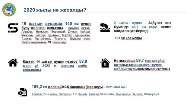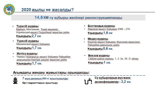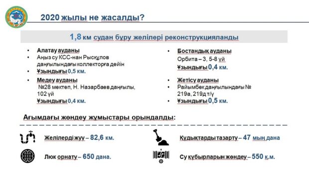 2020 жылы Ақбұлақ, Алғабас, Әлмерек, Ақжар, Боралдай, Думан, Құрамыс, Қарғалы, Кемел, Көлсай, Қайрат, Көкшоқы, Мұзтау, Нұршашқан, Самғау, Таужолы, Тастыбұлақ, Шұғыла шағын аудандарына, сондай-ақ Жетісу ауданының 89 көшесіне 160 шақырым су құбыры және 140 шақырым кәріз желілері салынды. Бұларға 60 мыңға жуық жеке үй қосылатын болады.