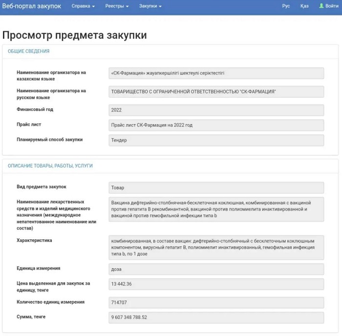 – Аталған екпелерді Medix және Prince Pharma Ltd деп аталатын екі компания әрбір дозасын 14 333 теңгеден тұрақты түрде сатып алып, бірнеше жыл бойы елге жеткізіп отырған. Әр жылы орта есеппен екпенің 600 мыңнан астам дозасы сатып алынатынымызды ескерсек, мемлекет бұл үшін қыруар қаржы жұмсағанын байқаймыз, – дейді «Әділдік жолы» ұйымының атқарушы директоры Дидар Смағұлов.