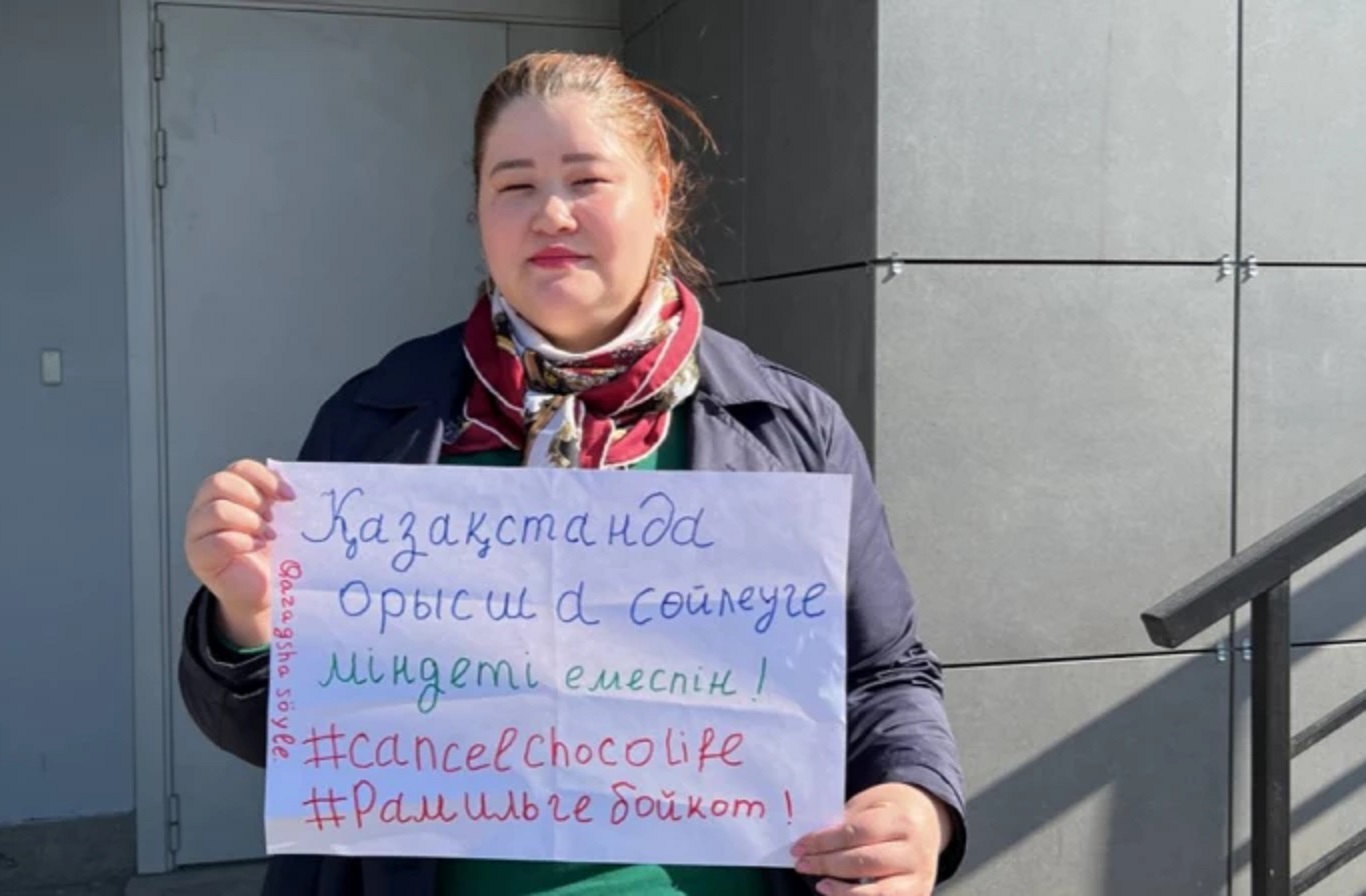 Оның қолында "Қазақстанда орысша сөйлеуге міндетті емеспін. #Сancel Chocolife, #Рамильге бойкот" деген жазуы бар плакат болды.