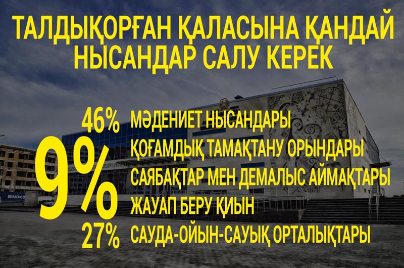 Талдықорған қаласында қандай нысандар салу қажет деген сауалнамаға респонденттердің 46% мәдени нысандарын, 27% сауда ойын сауық кешендерін, 9% қоғамдық тамақтандыру объектілерін, 9% саябақтар мен демалыс орындарын салу қажет деген пікірлерін білдірсе, 9% жауап беру қиын екендіктерін көрсетті.