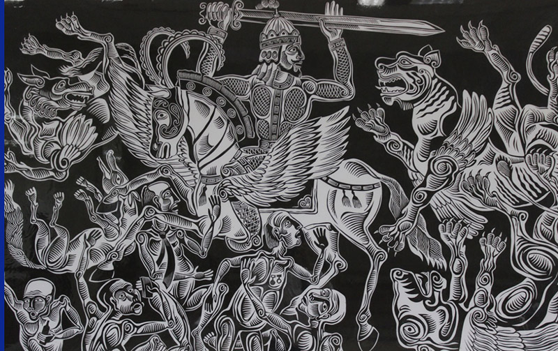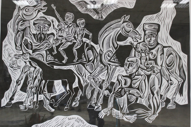 1500 шаршы метрлік залда суретшінің 150-ге жуық туындысы қойылған. Ерекшелігі – графикалар үлкен көлемде салынған. Бұл линогравюра саласындағы тың жаңалықтың бірі деуге болады. Көрмеде суретшінің "Ауылым алтын бесігім", "Абылай ханның түсі", "Көшпенділер", "Түркілер" және Абай мен Шыңғыс Айтматовтың шығармаларына топтама сынды бірнеше сериалар топтастырылған.