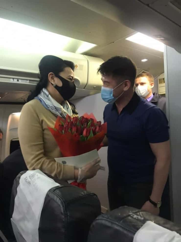 Осылайша Мәди Манатбек Шымкент-Алматы ұшағында 10 мың метр биіктікте бүкіл салонға хабарлап, Президенттің құттықтауы мен қала әкімінің атынан Шымкенттің символы - бір шоқ қызғалдақ гүлін табыс етті.
