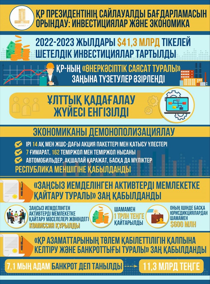 Айталық, 2022-2023 жылдары елімізегі $41,3 млрд тікелей шетелдік инвестициялар тартылып, отандық өндірушілер мен өнеркәсіп-инновациялық қызмет субъектілері арасында шикізат жеткізу бойынша міндеттемелерді енгізуге бағытталған Қазақстанның «Өнеркәсіптік саясат туралы» заңына түзетулер әзірленді. Бұл заң еліміздегі өндірістің алға басуына ықпал ете бастады деп айтуға толық негіз бар.
