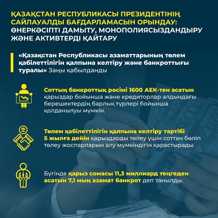 Ал халықтың әл-ауқатын жақсарту бағытында «Қазақстан Республикасы азаматтарының төлем қабілеттілігін қалпына келтіру және банкроттығы туралы» заң қабылданды. Аталымыш заң қабылданғаннан кейін қазір елімізде 11,3 млрд теңгеден астам сомма бойынша 7,1 мың азамат банкрот деп танылған.