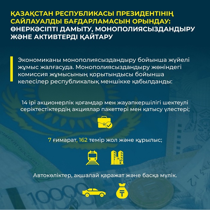 Ал экономиканы демонополизациялау бойынша жүйелі жұмыс жалғасуда. Демонополизациялау жөніндегі комиссия жұмысының нәтижелері бойынша республикалық меншікке қабылданып, олардың қатарында