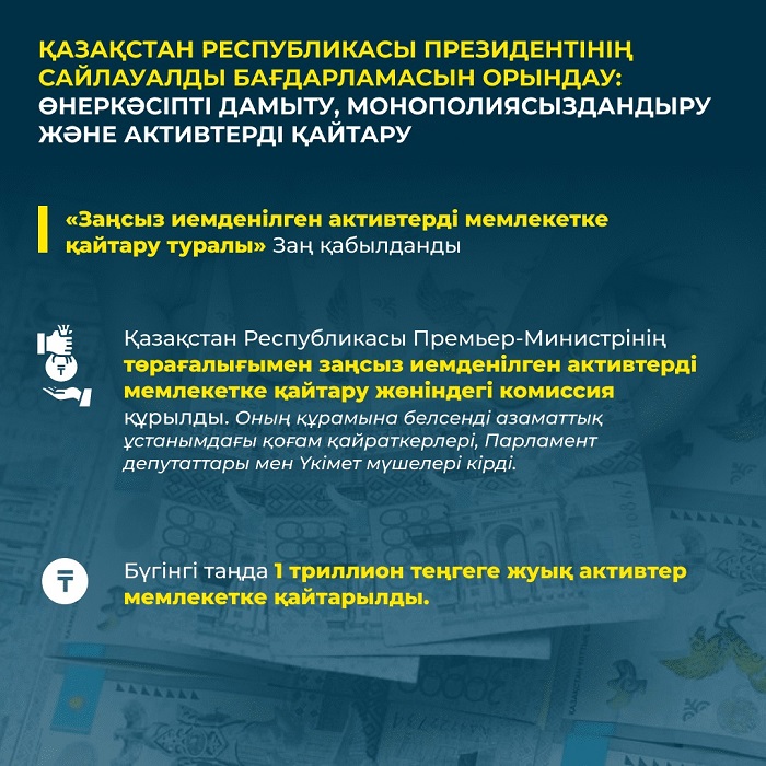 Бүгінгі таңда мемлекетке құны шамамен 1 трлн теңге сома болатын активтер қайтарылғаны.