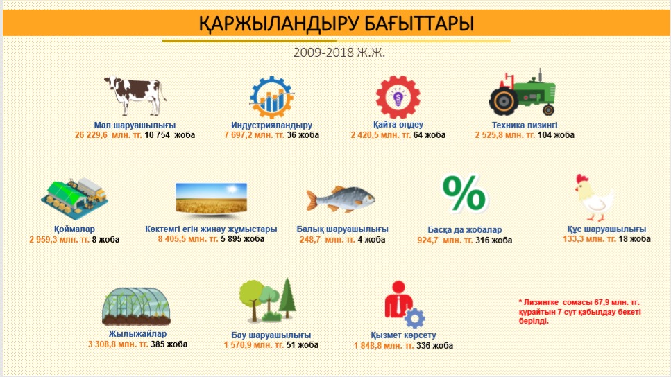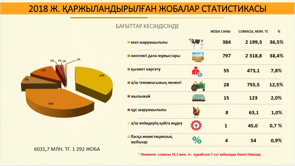 «2018 жылы  қаржыландырылған жобалар келесі басым бағыттар аясында жүзеге асырылды:  мал шаруашылығында – 2 млрд. 199,2 млн. теңгеге 384 жоба, дала жұмыстары бойынша – 1 млрд. 518,8 млн. теңгеге 766 жоба, өндіріс саласында – 28 млн. теңгеге 3 жоба, жылыжай бойынша – 123 млн. теңгеге 15 жоба, қызмет көрсету аясында – 425,1 млн. теңгеге 53 жоба, құс шаруашылығында – 11,9 млн. теңгеге 6 жоба қаржыландырылды», - деді Данияр Манатжанұлы.