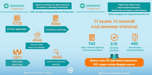 Биыл 15 наурыздан бастап партияның Түркістан облыстық филиалының мобильді қоғамдық қабылдауы өз жұмысын бастады. Бүгінге дейін мобильді топ аймақтың 11 аудан және қаласын аралап, 51 шалғай елді мекенде қоғамдық қабылдаулар өткізді.