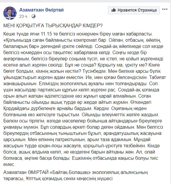 «Байтақ-Болашақ» экологиялық альянсының төрағасы, Ұлттық қоғамдық сенім кеңесінің мүшесі Азаматхан Әміртай Фейсбукатағы парақшасында өзіне белгісіз біреулер хабарласып, «саған байланысты компромат бар» деп қоқан-лоқы жасағанын айтты.