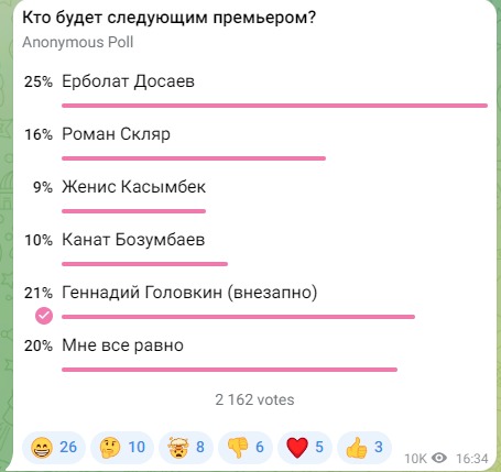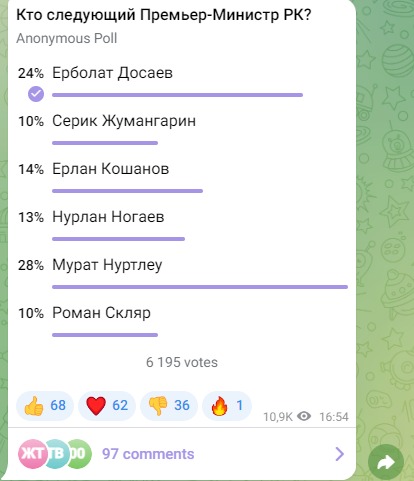 Telegram arnalarda túrli saýalnama paıda boldy. "Ulysmedıa" basylymy júrgizgen saýalnamaǵa sáıkes, Erbolat Dosaevqa "stavka" kóp.