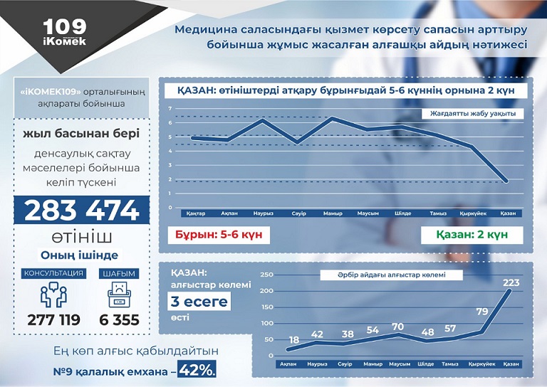 Sol kezde aýrýhanalar men emhanalardyń basshylary «iKomek109» mobıldik qosymshasy arqyly ótinishtermen jumys isteı bastady jáne turǵyndardyń shaǵymdary men usynystaryna jeke jaýap berdi. Aıdyń qorytyndysy boıynsha 2019 jyldyń 9 qazanynda bas dárigerlerdiń qatysýymen jıyn ótkizgennen keıin shaǵymdar men jaǵdaıattarǵa den qoıý ýaqytynyń edáýir azaıǵany, jaǵdaıattardy jabý ýaqytynyń 2 kúnge deıin qysqarýy baıqalady, buryn jaǵdaıattardy jabýǵa orta eseppen 5 kún ketetin.