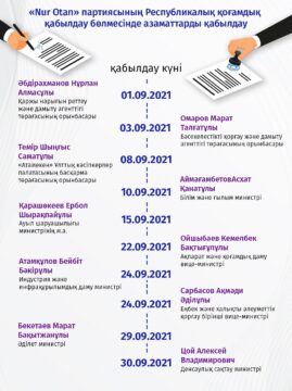 1 qyrkúıekte azamattardy qabyldaýdy Qarjy naryǵyn retteý jáne damytý agenttigi tóraǵasynyń orynbasary Nurlan Ábdiramanov, 3 qyrkúıekte – Básekelestikti qorǵaý jáne damytý agenttigi tóraǵasynyń orynbasary Marat Omarov, 8 qyrkúıekte – «Atameken» Ulttyq kásipkerler palatasynyń basqarma tóraǵasynyń orynbasary Shyńǵys Temir ótkizedi.
