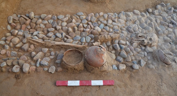 Jerlengen adamnyń sol jaǵynan 3 keramıkalyq buıym tabyldy. Jerleý shuńqyrynyń shyǵys bóliginde tonaýshylardyń izi baıqaldy, bul qańqa súıekteriniń kópshiliginiń joq bolýyn jáne birtutas áshekeı buıymdy quraǵan altyn monshaqtardyń kóp bóliginiń joq bolýyn túsindiredi.
