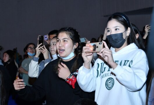 Keıin Janseıit Túımebaev ýnıversıtet stýdentterin ánurandy jandy daýysta hormen oryndaýǵa shaqyryp, jastarmen birge shyrqady.