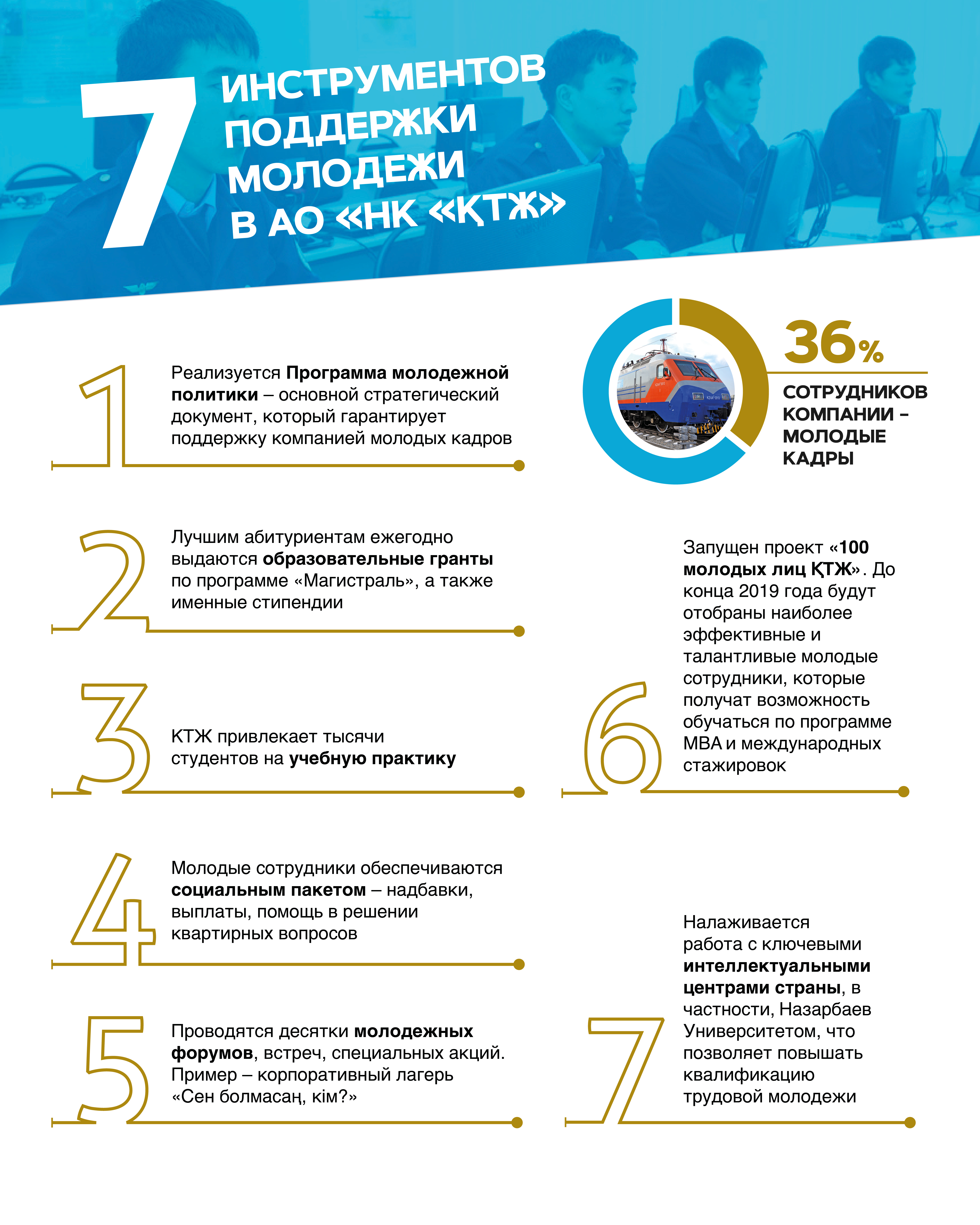 Búgingi tańda QTJ qataryndaǵy 126 myń adamnyń 36 paıyzy jastar. Sol sebepti kompanıanyń jańa top-menedjmentiniń bastamasymen qolǵa alynǵan jas kadrlardy qoldaý strategıasy ózin-ózin aqtaıtyn joba, onyń nátıjesin jaqyn ýaqytta kóretin bolamyz.