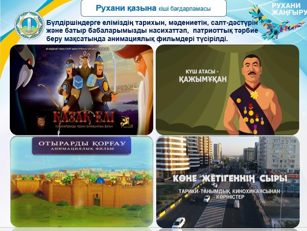 «Rýhanı jańǵyrý» jobalyq keńseniń bas menejeri Damır Júnisovtiń aıtýynsha, Elbasynyń maqalasyndaǵy atalǵan 6 baǵyt boıynsha óńirde aǵymdaǵy jyly jańa tyń jobalar qolǵa alynyp, atqarylatyn jumystar jandana túsedi. Atap aıtqanda, túrli taqyrypta derekti jáne anımasıalyq fılmder, respýblıkalyq forýmdar, tanymdyq baıqaýlar men festıválder uıymdastrylady.