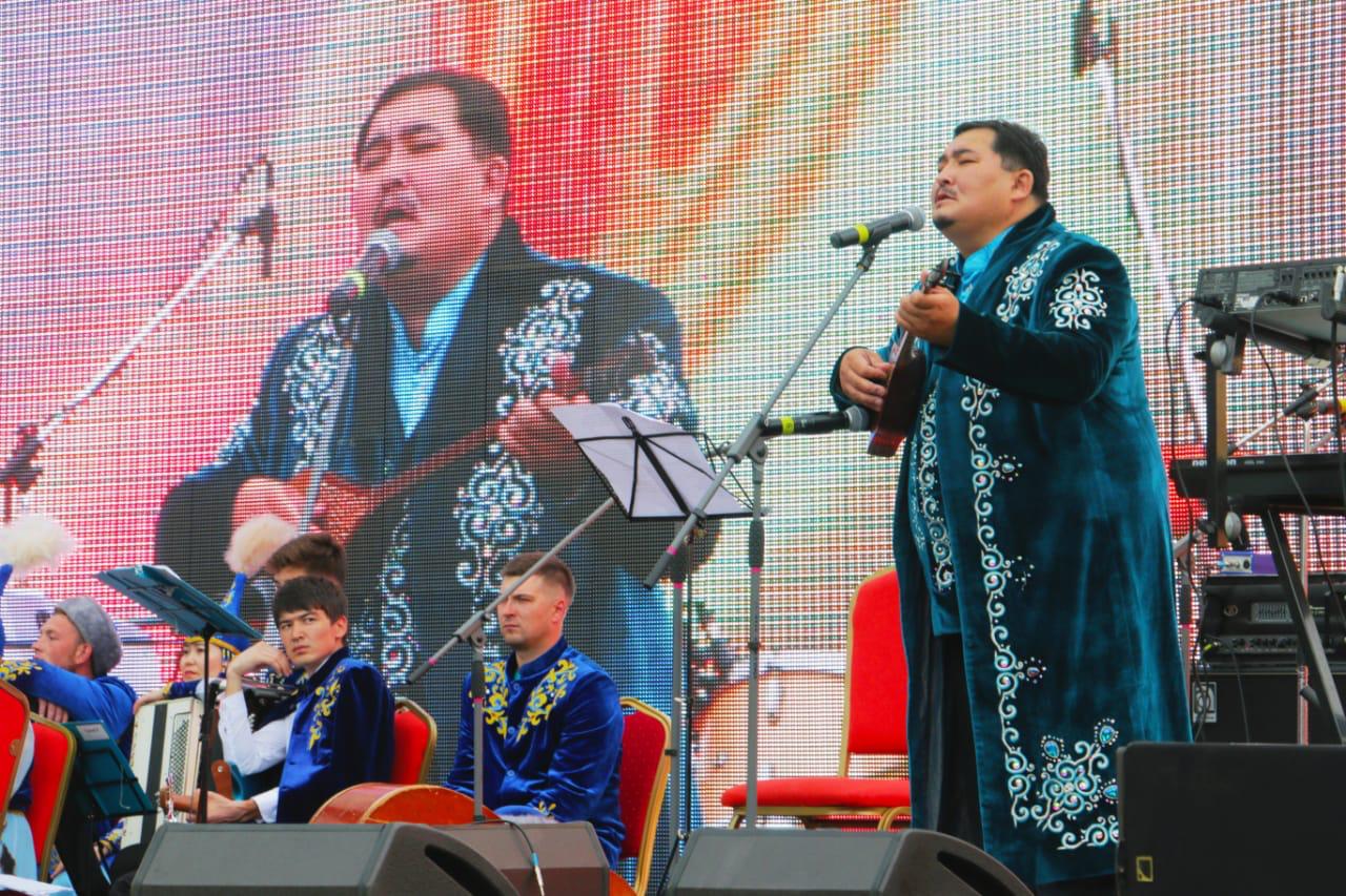 Sahnada sımfonıalyq jáne Baıjigit atyndaǵy qazaq halyq aspaptar atyndaǵy orkestrynan bólek estrada juldyzdary óner kórsetti.