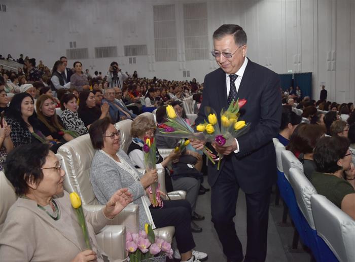 Forýmdy Ál-Farabı atyndaǵy QazUÝ-dyń Basqarma Tóraǵasy – Rektory Janseıit Túımebaev ashyp, áıelder qaýymyn kóktem merekesimen quttyqtady.