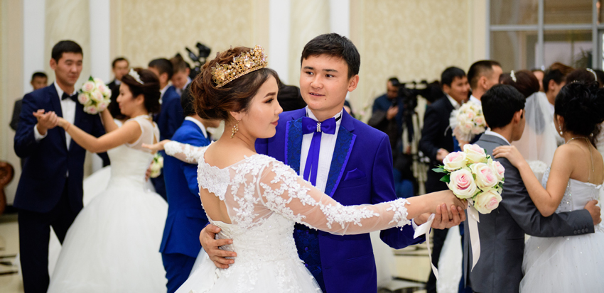 Ǵımarattyń kógildir lentasy qıylǵannan keıin qatysýshylar men shara qonaqtary neke qıý zalyna ótip, osy saraıdyń tabaldyryǵyn alǵashqy bolyp attaǵan 2 juptyń neke qıý rásimine kýá boldy. Oblys basshysy jas otaý ıelerine jáne shańyraq kótergenderine 50 jáne 60 jyl bolǵan sharanyń qurmetti qonaqtaryna estelik syılyqtar tabystady.