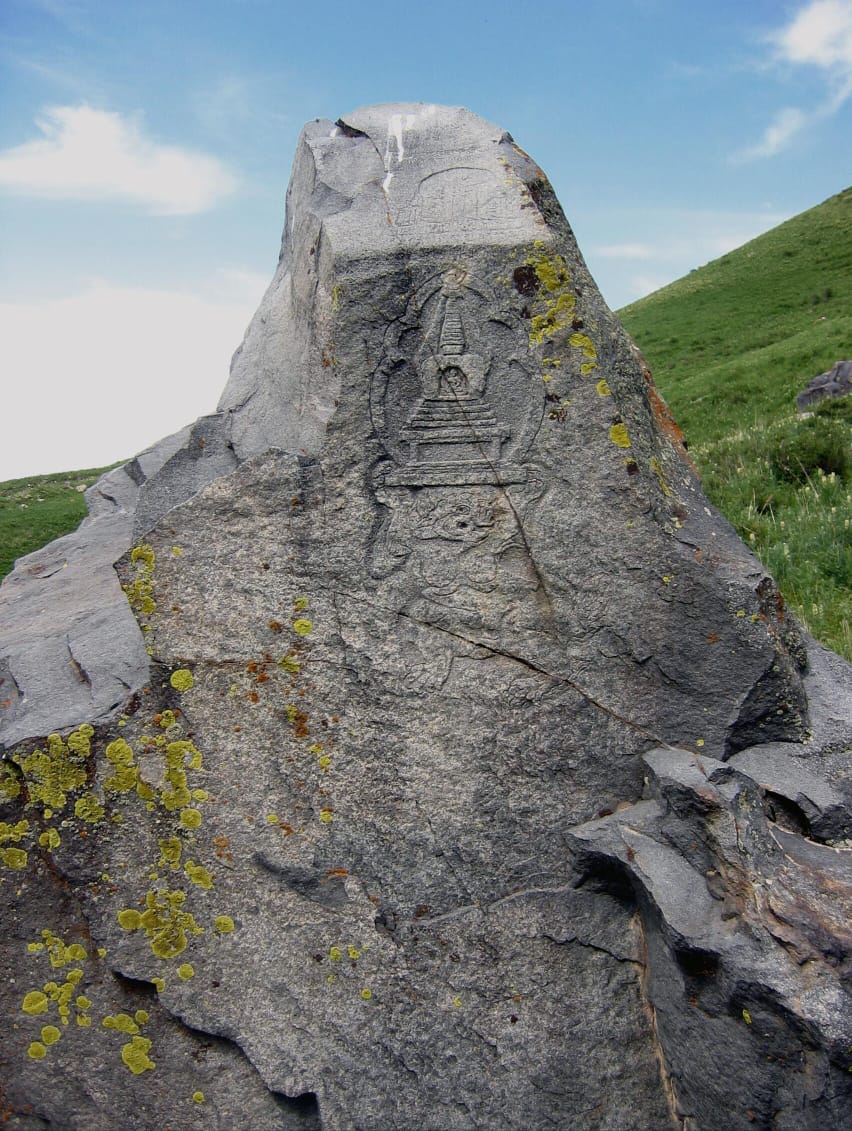 Zertteýshilerdiń paıymdaýynsha, bul beıneniń joǵarǵy jaǵynda qalmaq álipbıimen lamalardyń qasıetti sózderi jazylǵan.
