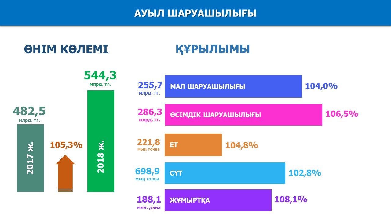 Sonymen qatar, egin sharýashylyǵynda ótken jyly 286,3 mlrd. teńgeniń ónimi óndirilip, 2017 jylmen salystyrǵanda 6,5 paıyzǵa artyp otyr. 2018 jyly aýyl sharýashylyǵy daqyldarynyń egis kólemi 807,4 myń gektarǵa ornalastyrylyp, 2017 jylmen salystyrǵanda 9 myń gektarǵa kóbeıgen.