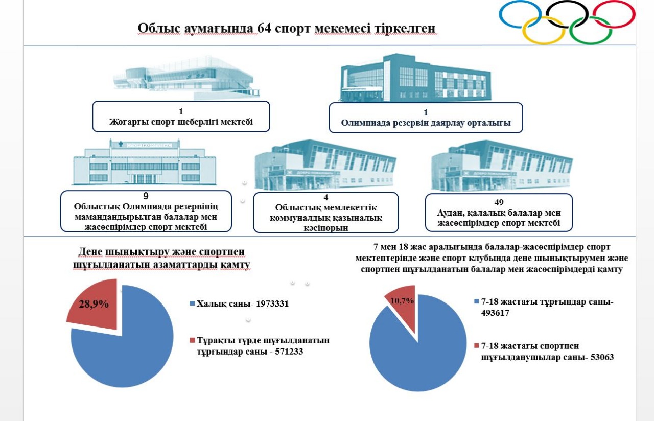 Buqaralyq sportty damytý maqsatynda 2018 jyly oblys aýmaǵynda 4026 sporttyq is-shara ótkizilip, oǵan 571,2 myń adam qatysqan. Oblys turǵyndarynyń sportpen shuǵyldaný kórsetkishi 28,9 paıyzdy qurap otyr.