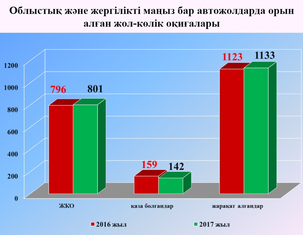 Ábdiǵanı Seıdýalıevtiń aıtýynsha, profılaktıkalyq sharalardyń nátıjesinde oblys aýmaǵyndaǵy joldarda oryn alǵan jol kólik oqıǵalary 5,9 paıyzǵa tómendegen. Alaıda oblystyq jáne jergilikti mańyzdy avtojoldarda bolǵan 801 JKO-nyń saldarynan 142 tulǵa qaza taýyp, 1133 tulǵa ártúrli dene jaraqat alǵan.