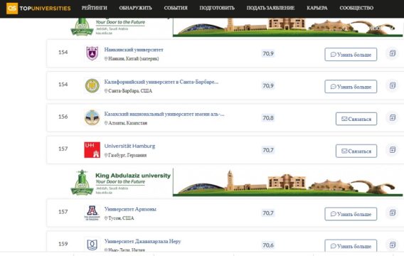 QazUÝ ótken jylmen salystyrǵanda «Óner jáne gýmanıtarlyq ǵylymdar» páni boıynsha óz kórsetkishterin 277-den 156-shy orynǵa, «Áleýmettik ǵylymdar jáne menejment» páni boıynsha 351-den 257-shi orynǵa kóterip, oń nátıjege qol jetkizdi.