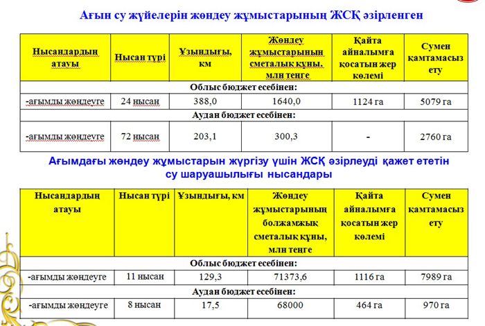 Соынмен қатар аудан бюджет есебінен 300,0 млн теңгеге 203,1 шақырым болатын 72 канал-қашыртқылар жөндеу жұмыстарының ЖСҚ әзірленген. Жөндеу жұмыстары жүргізілген соң, 2760 гектар жерді сумен қамтамасыз ету ісі жақсаратын болады.