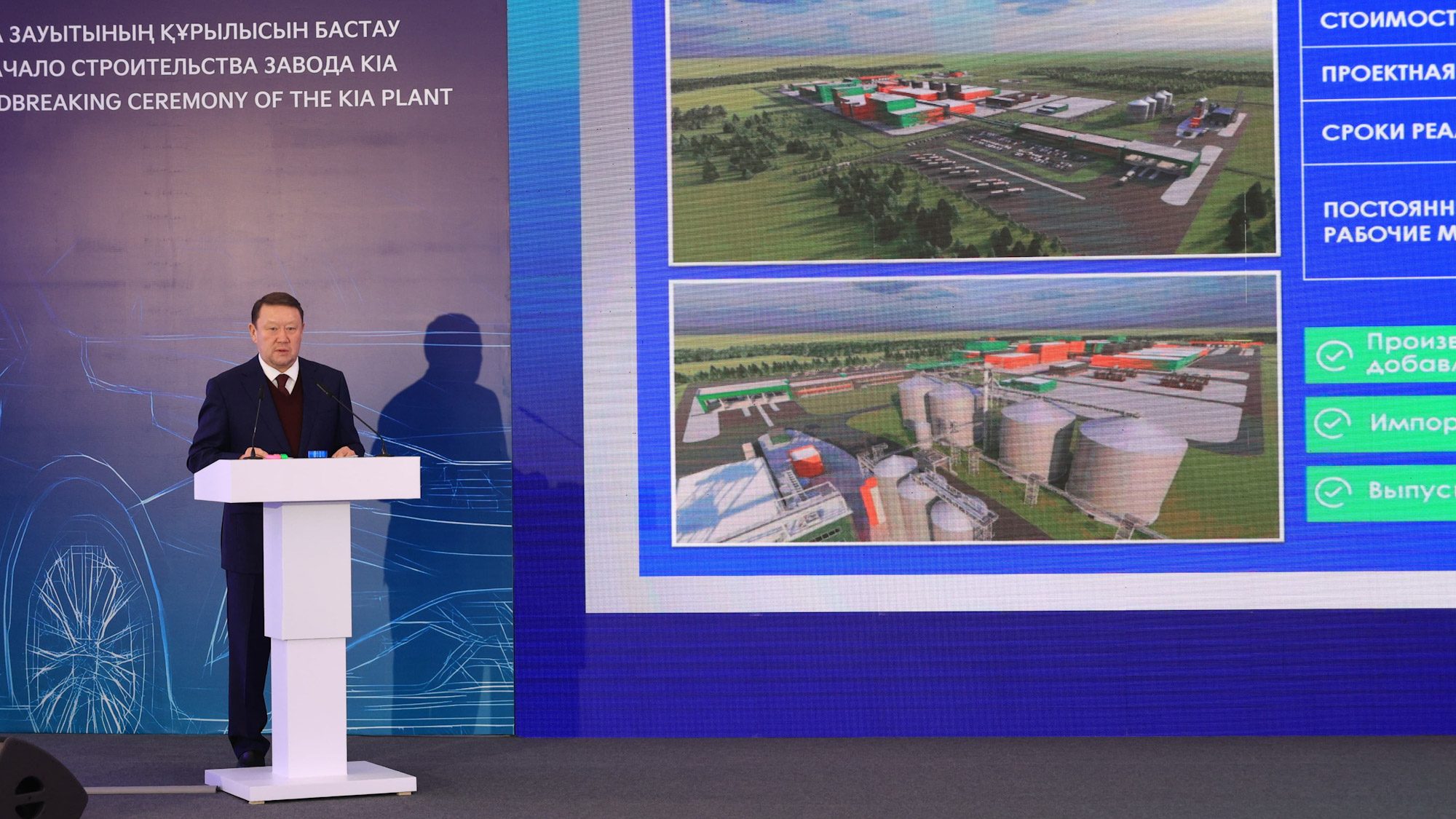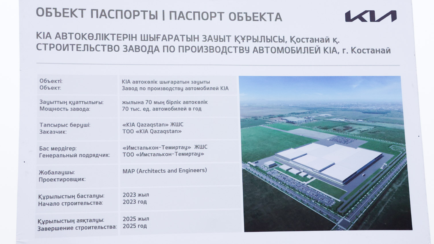 Қостанайда Kia автомобильдері өндірісінің толық циклін қамтитын зауыттың құрылысы басталды. Құрылыс жұмыстарын ресми бастау рәсіміне ҚР Премьер-Министрінің бірінші орынбасары Роман Скляр және Қостанай облысының әкімі Құмар Ақсақалов қатысты.