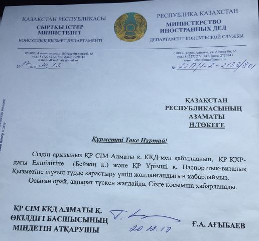Нұртай Төке көп өтпей жергілікті адвокатымен кеңесу арқылы ҚР Сыртқы Істер министрлігі Алматы қаласы өкілдігі басшысына арыз жазған. Оған келген жауап хатта Н. Төкенің арызы  «бұл іс бойынша ҚР-ның ҚХР-дағы Елшілігіне (Бейжің қаласы) және Үрімжідегі паспорттық-визалық Қызметіне шұғыл түрде қарастыру үшін» жолданғанын хабарлаған. Жауап хат қолына тиісімен Нұртай Төке Үрімжідегі елшілік қызметкерлеріне де барып қайтқанын айтады. Олар да Қытайдың тиісті мекемелеріне осы іс негізінде сұрау салғанымен, ешқандай жауап ала алмағандарын, бұл оқиғаны бақылауда ұстайтындарын айтып шығарып салған.