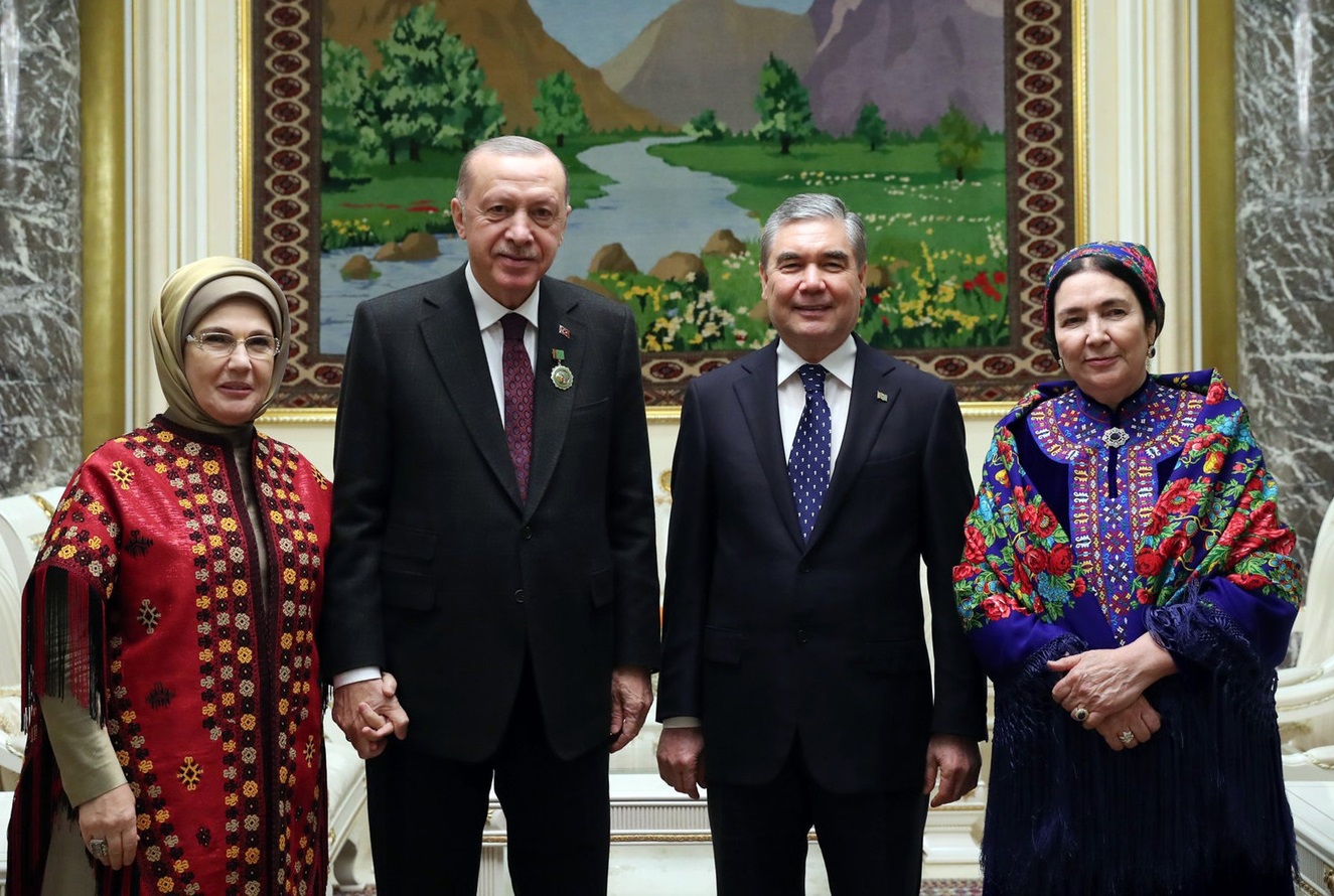 Ердоған әйелімен қол ұстасып тұр, ал Түркіменстан басшысының жұбайы Огүлгерек Бердімұхамедованың бет-жүзін көргеніміз енді ғана.