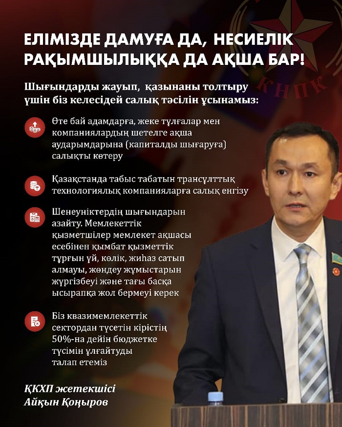 دەپۋتات ۇكىمەتكە قارجىنى قايدان الۋعا بولاتىنىن سوقىرعا تاياق ۇستاتقانداي قىلىپ كورسەتىپتى. ول ۇكىمەتتىڭ حالىققا نەسيەلىك راقىمشىلىق جاساۋعا قارجىلىق الەۋەتى تولىق جەتەتىنىن سەنىمدى.
