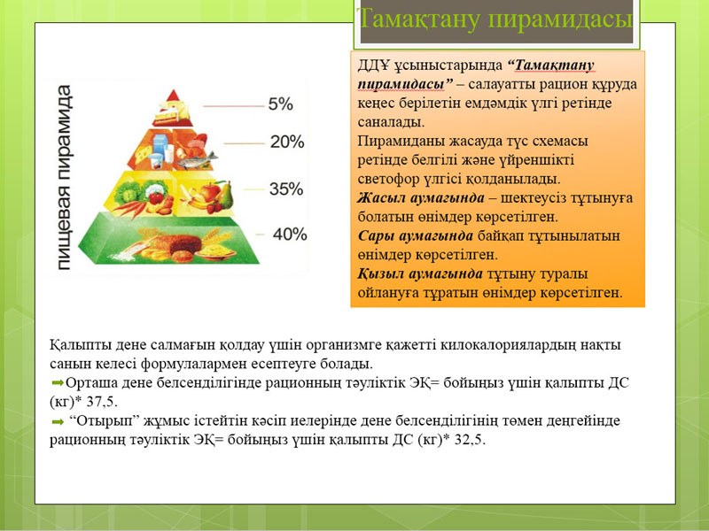 ەلىمىزدە سالاۋاتتى ءومىر سالتى ورتالىعىنىڭ 1998 جىلدان باستاپ، ءار ءۇش جىل سايىن جۇرگىزگەن زەرتتەۋلەرىنە سۇيەنسەك، ادامداردىڭ باسىم بولىگى كۇنىنە ەكى رەت ىستىق تاماق تۇتىنبايدى. ال، 12 پايىزى ءۇش رەت اس ىشەتىنىن ايتسا، 9 پايىزى بار بولعانى ءبىر تاۋلىكتە ءبىر رەت قانا قورەكتەنەدى. تۇرعىنداردىڭ جارتىسىنا جۋىعى كۇندەلىكتى اسىنىڭ 400 گراممى جەمىس-جيدەك بولۋى ءتيىس ەكەنىن بىلمەيدى دە. ساۋالناماعا قاتىسقانداردىڭ كوبىسى ءتيىستى مولشەردە ەت ونىمدەرىن پايدالانبايدى ەكەن.