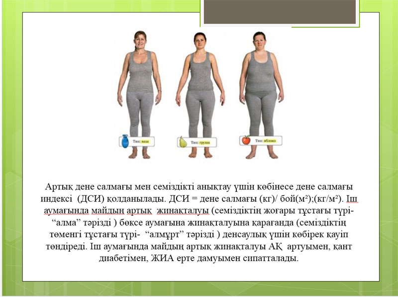 قازاق تاعامتانۋ اكادەمياسىنىڭ 2012 جىلى جۇرگىزگەن زەرتتەۋىنىڭ ناتيجەسىنە سۇيەنسەك، قازاقستان حالقىنىڭ جارتىسىنان استامى ارتىق سالماققا جانە سەمىزدىككە شالدىققان. 1 جانە 14 جاس ارالىعىنداعى ءاربىر بەسىنشى بالا ارتىق سالماقتان زارداپ شەگەدى. بۇل – تۇرعىنداردىڭ 21،5 پايىزى. بۇلاردىڭ جارتىسى سەمىزدىككە شالدىققان، – دەيدى ارداق بايباراق قىزى.