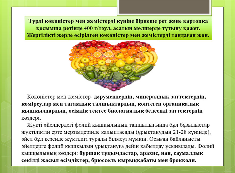 – بالالار اراسىندا فاستفۋد ونىمدەرىن تۇتىنۋ بەلەڭ الىپ بارادى. زەرتتەۋلەرگە سۇيەنسەك، جاسوسپىرىمدەردىڭ 13،7 پايىزى كۇنىنە ءبىر رەت فاستفۋدتى ازىق ەتەدى. سونىمەن قاتار، ۇيقىعا جاتاردا تاماقتانۋ، دەنە بەلسەندىلىگىڭ ازدىعى، قيمىلدىڭ جوقتىعى جۇرەك قان تامىرلارى اۋرۋلارىنا، سەمىزدىككە تاعى باسقا دا كوپتەگەن اۋرۋلاردىڭ اسقىنۋلارىنا اكەلىپ سوعۋدا. ال، ءتيىمدى تاماقتانۋ كەيبىر سوزىلمالى اۋرۋلارى بار ادامداردىڭ دەنساۋلىعىن جاقسارتۋعا نەگىز بولادى»، – دەيدى ايگۇل جاقىپ قىزى.