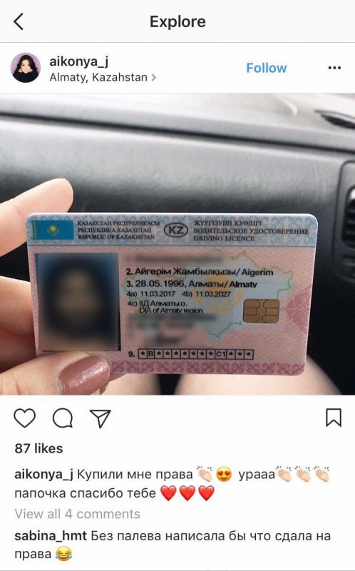 "ماعان جۇرگىزۋشى كۋالىگىن ساتىپ اپەردى، راقمەت، اكەتايىم"، - دەپ جازعان قىز جۇرگىزۋشى كۋالىگىنىڭ سۋرەتىن سالىپ.