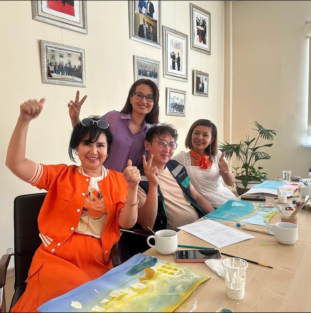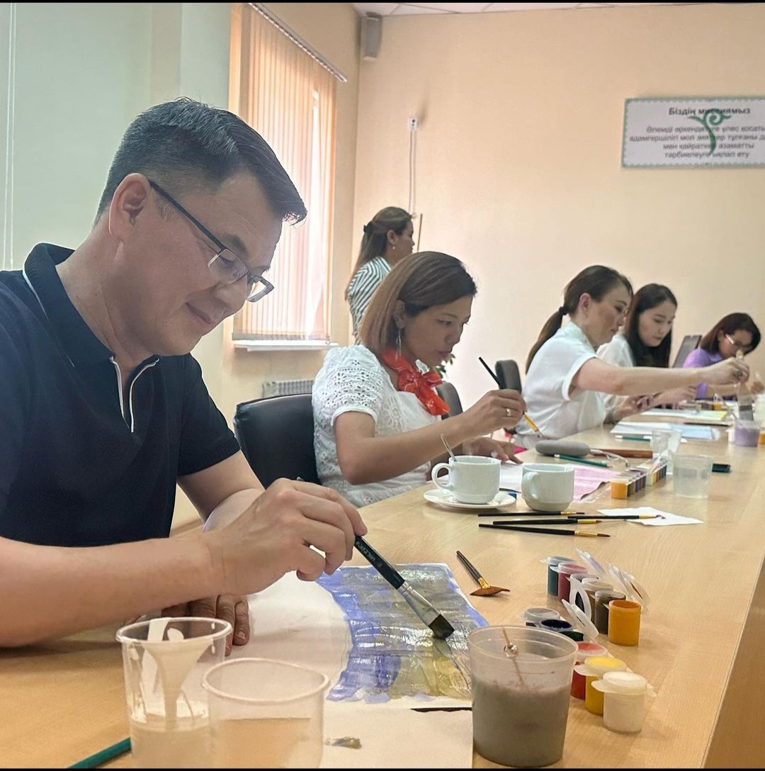 ءبىر ساعاتقا كونفەرەنس-زال شىعارماشىلىق الاڭعا اينالدى، كەسكىندەمەلەرىنە ءۇڭىلىپ اركىم ءوز قيالدارىن، جازدىق دەمالىستارىن سۋرەتتەۋگە كىرىستى. ارماندا جۇرگەن ەلگە، ارالعا، قالاعا بارعانىن ەلەستەتىپ سۋرەتكە اينالدىرۋدى ونەر ساباعىنىڭ مۇعالىمدەرىنىڭ نۇسقاۋلارىمەن وڭاي دا قىزىقتى بولدى. سوڭىندا ءار قوناق ءوز كەسكىندەمەسىن اعىلشىن تىلىندە سۋرەتتەپ، كاراوكەمەن ءان ايتىلدى.