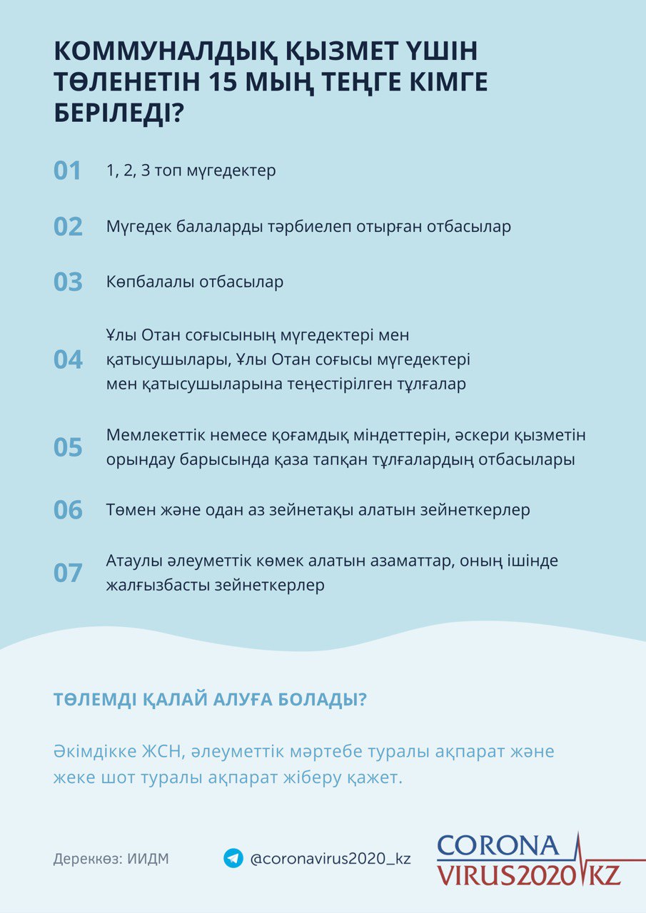 15 مىڭ تەڭگە مولشەرىندەگى تولەم اي سايىن كوممۋنالدىق قىزمەتتەردى تۇتىنۋشىلاردىڭ ەسەپشوتىنا (ابونەنتتىك شوتقا) جىبەرىلەتىن بولادى.