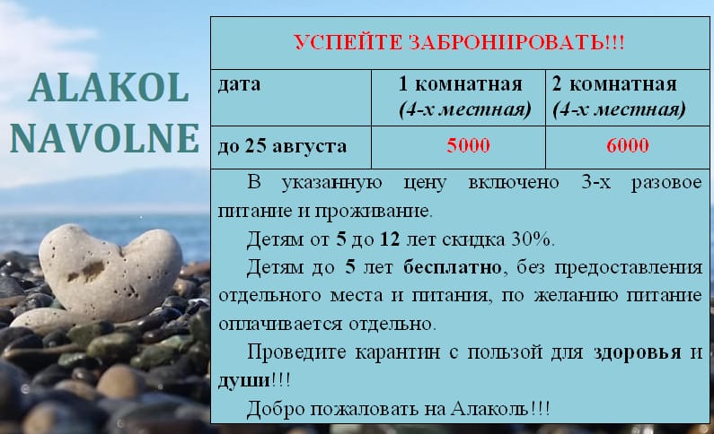 ەڭ باستىسى تامىزدىڭ 25-نە دەيىن 3-مەزگىل تاماعىمەن ءبىر بولمە 4 جاتىن ورىنىمەن كىسى باسىنا 5000 تەڭگە، 2 بولمە 4 جاتىن ورىنىمەن كىسى باسىنا 6000 تەڭگە. 5 جاستان-12 جاسقا دەيىن بالالارعا 30 پايىز جەڭىلدىك قاراستىرىلعان.