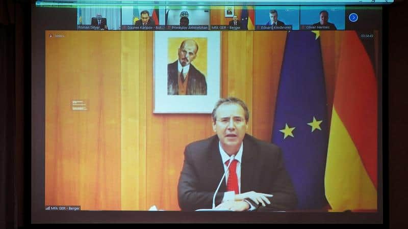 ونلاين كەزدەسۋگە گەرمانيا ەكونوميكاسىنىڭ شىعىس كوميتەتىنىڭ ءتوراعاسى وليۆەر گەرمەس مەن گفر-دىڭ سىرتقى ىستەر مينيسترلىگىنىڭ مەملەكەتتىك حاتشىسى بەرگەر ميگەل قاتىسىپ، نەمىس كاسىپورىندارىنىڭ قورشاعان ورتانى قورعاۋ سالاسىنداعى جەتىستىكتەرىن ءسوز ەتتى. وسى رەتتە ونلاين كەزدەسۋدى نەمىستىڭ ايگىلى Siemens، BASF، Henkel، WILO SE، LLP C، Spaarmann، Becker Mining Europe GmbH، Svevind Energy GmbH، Robert Bosch سىندى 100-گە جۋىق كومپانيالارىنىڭ وكىلدەرى باقىلاپ، قازاقستانمەن اراداعى ەكونوميكالىق بايلانىستى نىعايتۋعا قىزىعۋشىلىق تانىتتى.