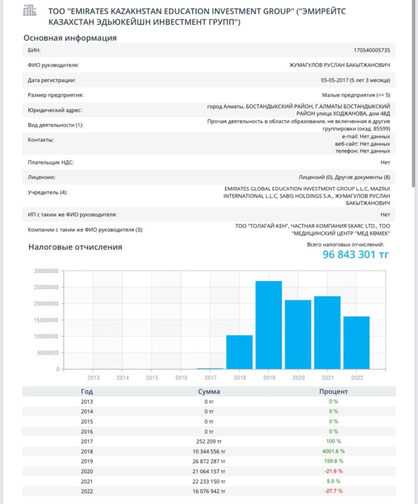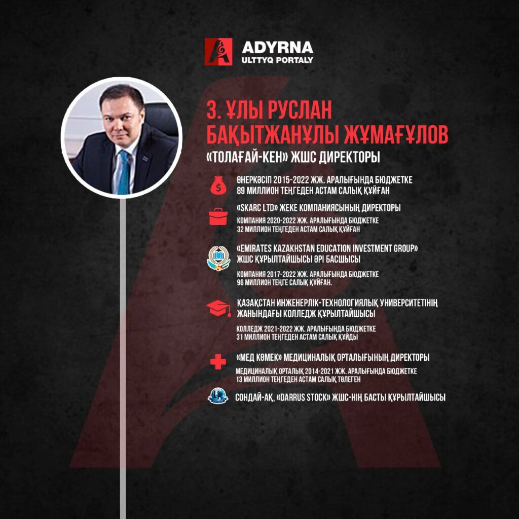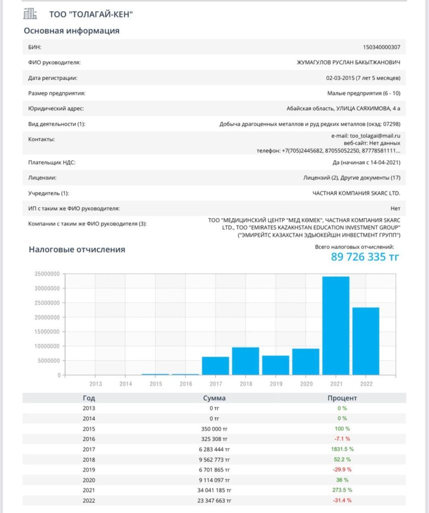 2018-2022 جىلدار ارالىعىندا مەملەكەت قازىناسىنا 15 ميلليون تەڭگەدەن استام سالىق تولەگەن. 2018 جىلى – 41 مىڭ تەڭگە عانا سالىق قۇيسا، 2021 جىلى – 6،3 ميلليون تەڭگەدەن استام، ال بيىل بيۋدجەتكە – 3،7 ميلليون تەڭگەدەن استام سالىق قۇيعان. 20% كولەمىندە سالىق سالىنسا، دەمەك اككرەديتتەۋ اگەنتتىگىنىڭ 2018-2022 جج. تازا تابىسى - 75 ميلليون تەڭگەنى قۇرايدى. سونىمەن قوسا الينا جۇماعۇلوۆانىڭ «ALDATE» ج ش س، «ينتەر بەك» ج ش س قۇرىلتايشىسى ەكەنى انىقتالدى.