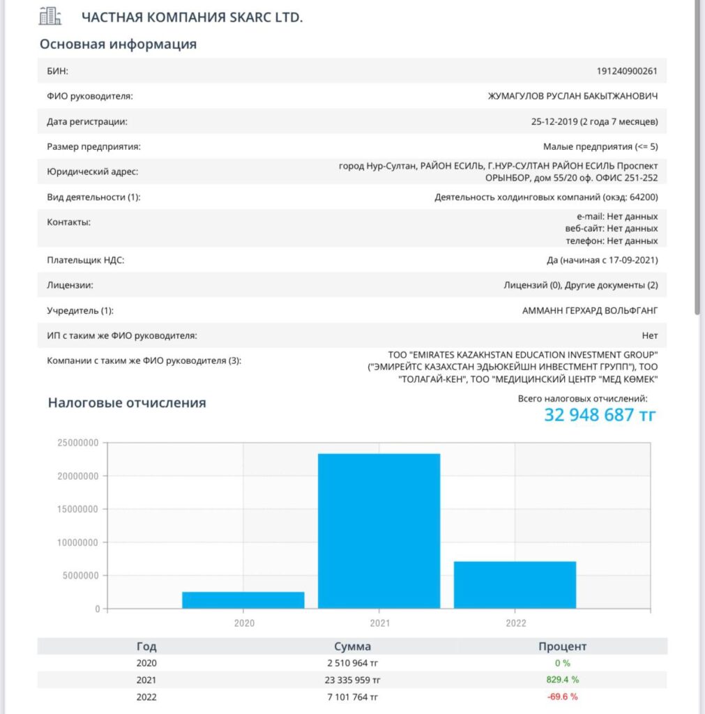 اشىق دەرەككوزدەرگە سايكەس 2019 جىلدىڭ 25 جەلتوقسانىندا قۇرىلعان «SKARC LTD» جەكە كومپانياسى - شۆەيساريا قارجى قورىمەن بىرلەسىپ ەلدىڭ گەولوگيالىق بارلاۋىنا ءىرى شەتەلدىك ينۆەستورلاردى تارتۋ بويىنشا قۇرىلعان حالىقارالىق ينۆەستيسيالىق كومپانيا. 2020-2022 جىلدار ارالىعىندا مەملەكەت قازىناسىنا 32 ميلليون تەڭگەدەن استام سالىق قۇيعان. 20% كولەمىندە سالىق سالىنسا، دەمەك كومپانيانىڭ 2020-2022 جج. تازا تابىسى - 160 ميلليون تەڭگەنى قۇرايدى.