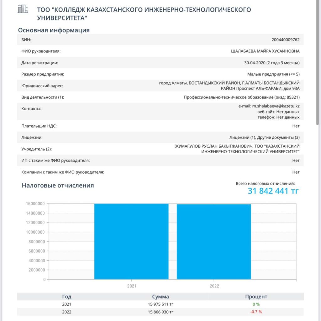 2010 جىلى - 8 ميلليون تەڭگە سالىق تولەسە، 12 جىلدان كەيىن بۇل كورسەتكىش 7 ەسە ارتىپ، ۋنيۆەرسيتەت بيىلعى جىلدىڭ وزىندە ەل قازىناسىنا - 55 ميلليون تەڭگەگە جۋىق سالىق تولەپ ۇلگەرگەن. 20% كولەمىندە سالىق سالىنسا، دەمەك ۋنيۆەرسيتەتتىڭ 2010-2022 جج. تازا تابىسى - 1 ميلليارد 800 ميلليون تەڭگەنى قۇرايدى.
