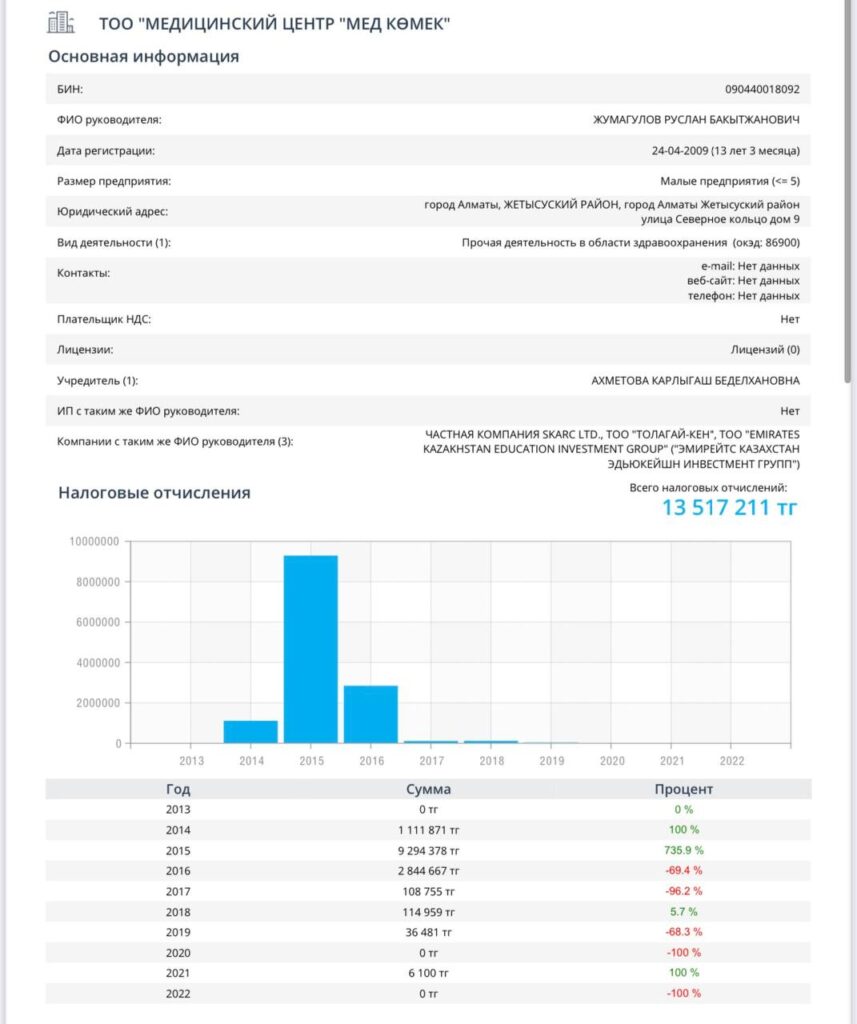 2014-2021 جىلدار ارالىعىندا ەل قازىناسىنا 13 ميلليون تەڭگەدەن استام سالىق تولەپتى. ەڭ قىزىعى، مەديسينالىق ورتالىق 2015 جىلى بيۋدجەتكە – 9 ميلليون تەڭگەدەن استام تەڭگە قۇيسا، 2018 جىلى – 114 مىڭ تەڭگە عانا قۇيعان. ودان كەيىنگى جىلدارى سالىق كولەمى تىپتەن ازايىپ، 2019 جىلى - 36 مىڭ، 2020 جىلى – 0 تەڭگە، 2021 جىلى – 6100 تەڭگە، 2022 جىلى تاعى دا 0 تەڭگە. دەمەك، بۇگىنگى كۇنى اتالمىش مەديسينالىق ورتالىق ءوز جۇمىسىن ۋاقىتشا توقتاتسا كەرەك. ول جاعى بىزگە ازىرگە بەيمالىم.