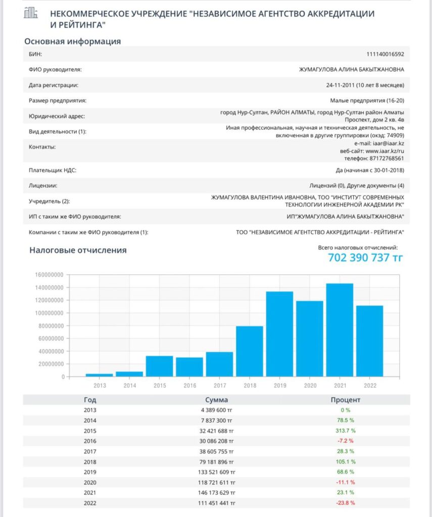 ۋنيۆەرسيتەتتەردىڭ ءبىلىم ساپاسىن باعالايتىن اگەنتتىك 2013-2022 جىلدار ارالىعىندا مەملەكەت قازىناسىنا 702 ميلليون تەڭگە كولەمىندە سالىق تولەگەن. 2013 جىلى بيۋدجەتكە 4 ميلليون تەڭگەدەن استام سالىق قۇيسا، 8 جىلدان كەيىن بۇل كورسەتكىش 25 ەسە ارتىپ، 2022 جىلى بيۋدجەتكە 111 ميلليون تەڭگەدەن استام سالىق تولەگەن. 20% كولەمىندە سالىق سالىنسا، دەمەك اككرەديتتەۋ اگەنتتىگىنىڭ 2013-2022 جج. تازا تابىسى - 3 ميلليارد 510 ميلليون تەڭگەنى قۇرايدى.