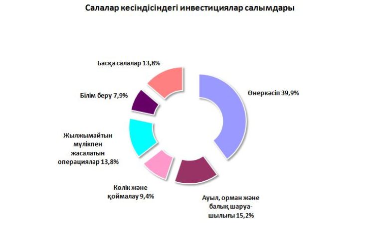 ينۆەستيسيا سالىمدارىنىڭ باسىم بولىگى ونەركاسىپ، اۋىل، ورمان جانە بالىق شارۋاشىلىعى جانە جىلجىمايتىن مۇلىكپەن جاسالاتىن وپەراسيالار سالالارىنا تيەسىلى. نەگىزگى ينۆەستيسيالىق سالىمداردىڭ 80،7 پايىزىن شاعىن كاسىپورىندار جۇزەگە اسىرعان، ولاردىڭ كولەمى – 232 ملرد. 376 ملن. تەڭگە.